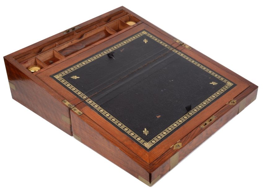 of rectangular form with brass banding and initialled cartouche, the fitted interior with leather lined writing slope, fitted compartments and secret three drawers.