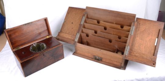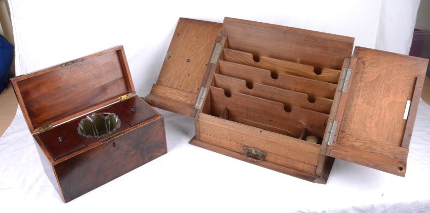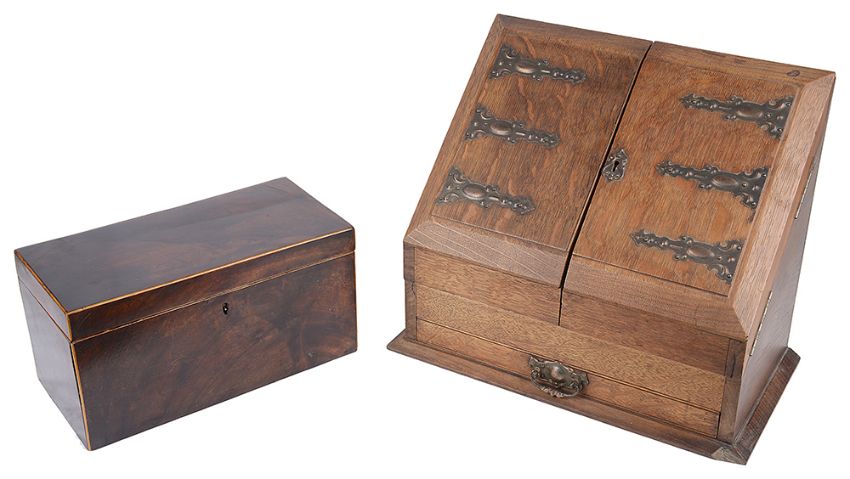 An early 20th century oak correspondence box and a 19th century mahogany tea caddy,