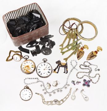 A collection of Victorian jet, three silver pocket watches and other items