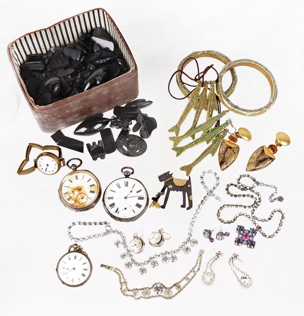 the jet pieces unstrung, three silver cased gentleman's pocket watches including Waltham, an amusing 'spotted dog' pin, a collection of Emma Somerset costume jewellery, Gail Klevan earrings