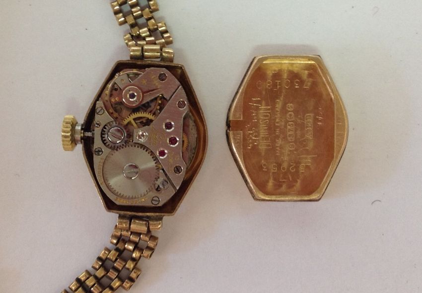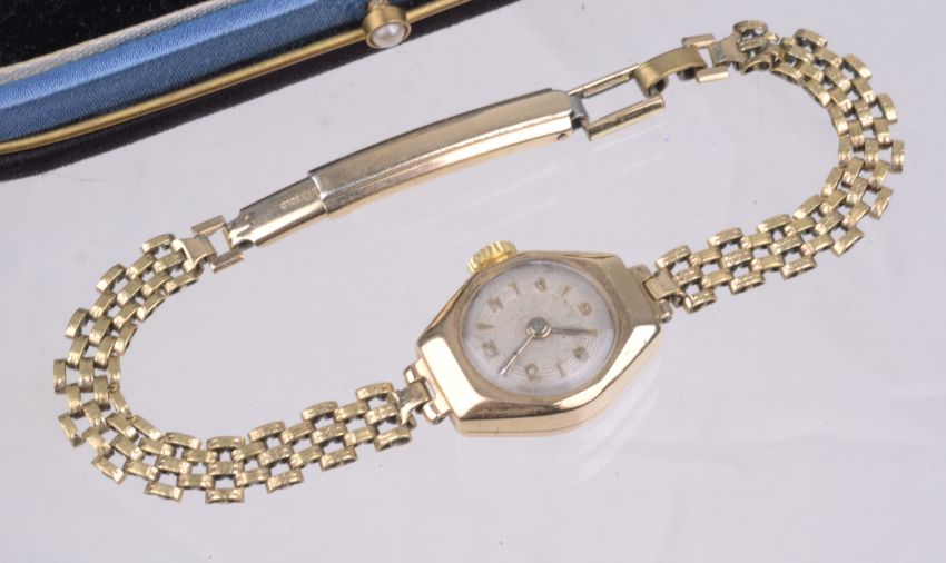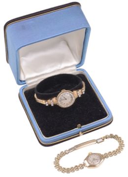 the circular dial with arabic quarter hours and batons, spade hands in a circular gold case with beads and diamond inset bezel, inset diamond and link bracelet with clasp, movement no. 30317?, case no. 89347 140, together with a 9ct gold Leda ladies wristwatch, the circular dial with arabic and baton hours in a hexagonal Dennison case, with link bracelet and clasp, (2).