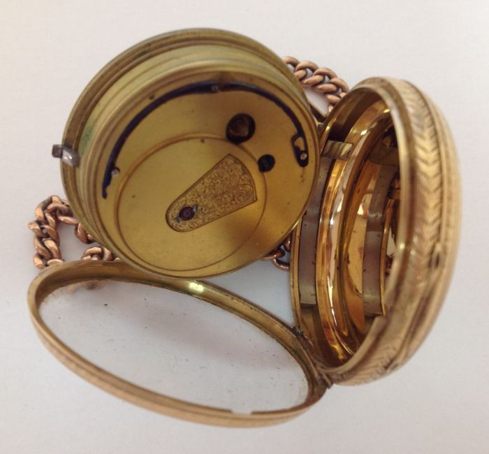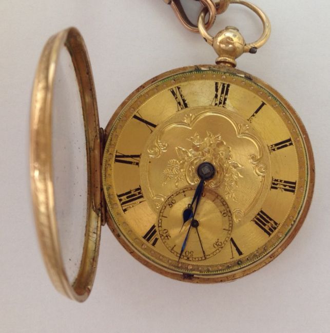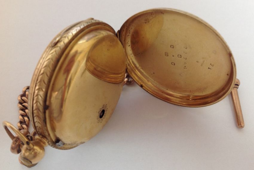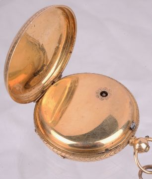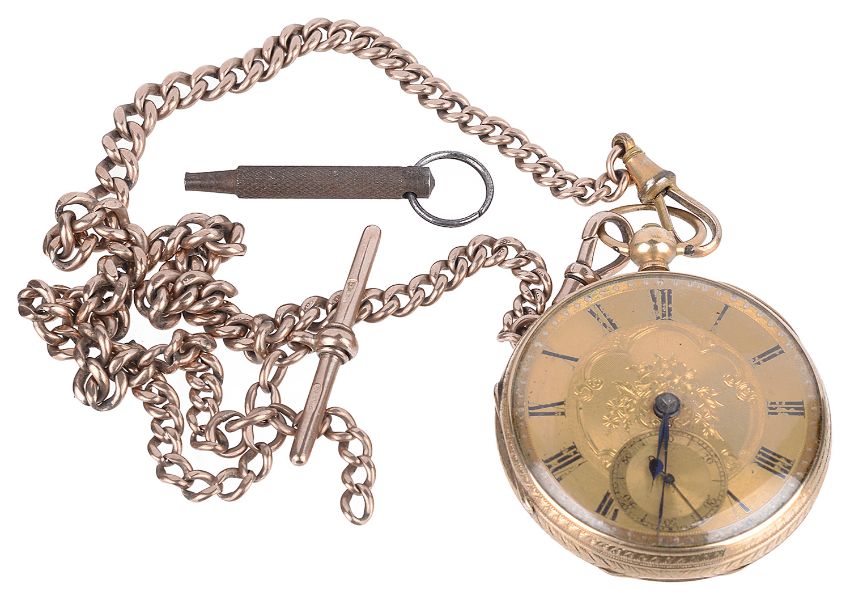 An 18ct gold open faced pocket watch, with 9ct rose gold watch chain