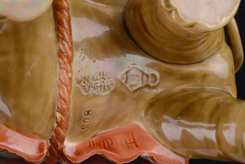the walking elephant with houdah, impressed marks and shape number 208, and Victorian registration lozenge