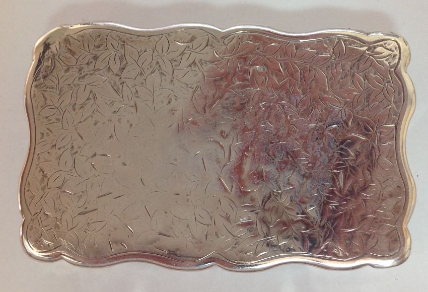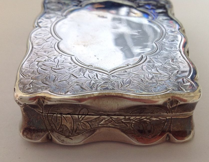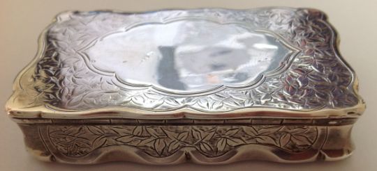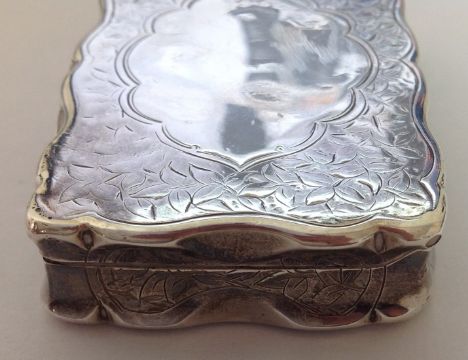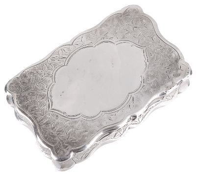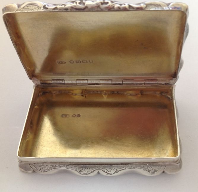 of rectangular form, the hinged lid with blank cartouche surrounded by foliate engraving, silver gilt interior, by George Unite.