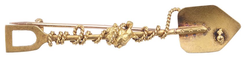 formed as a shovel with coiled rope around a golf nugget and another to the shovel tip, yellow metal tests for gold