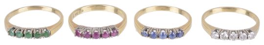 A set of four matching five stone diamond and gem set rings