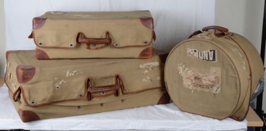 the two tan leather suitcases of differing sizes with metal locks and outer canvas covers with metal fastenings and original luggage labels and stickers, together with a matching hat box also with canvas outer cover and labels, (3).