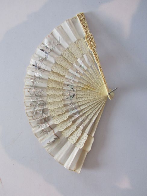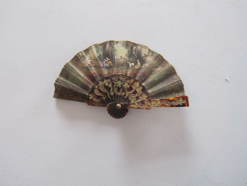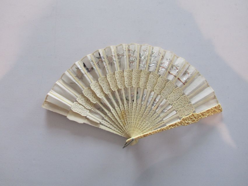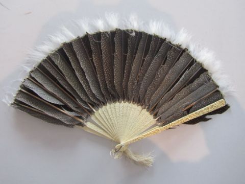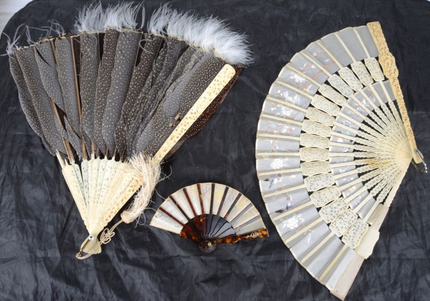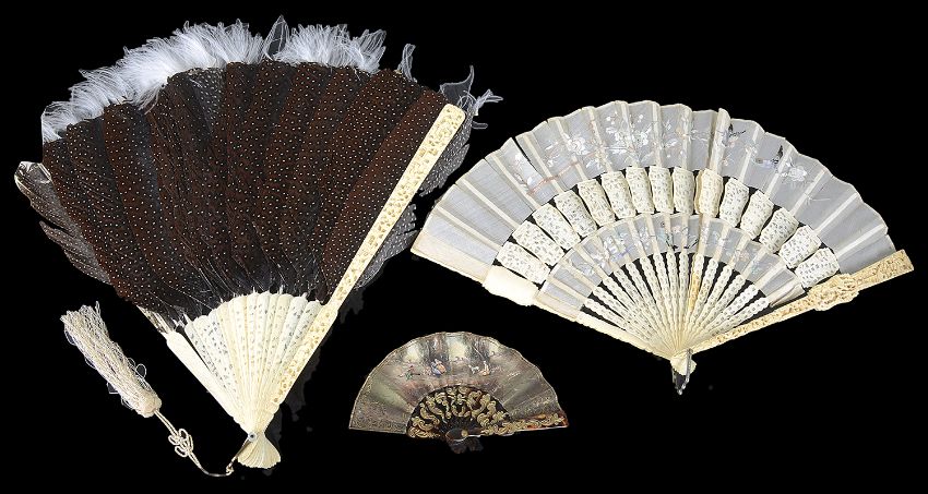 Condition: The former with some wear and some damage to the feathers. the second fan with one loose embroidered panel. to the The miniature fan opens well and is in good overall condition.