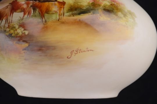 the pierced and scalloped neck above a beaded collar and squat bulbous body painted with English cattle with a river edge, signed J. Stinton, with flower sprays to the reverse shape number G701