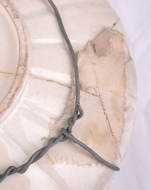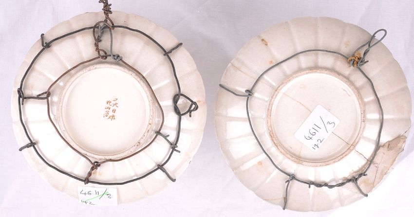 Condition: One of the saucers is in good to fair overall condition with some wear to gilt but generally good clear image, the second saucer has been broken and restored. Both items have wire plate hangers.