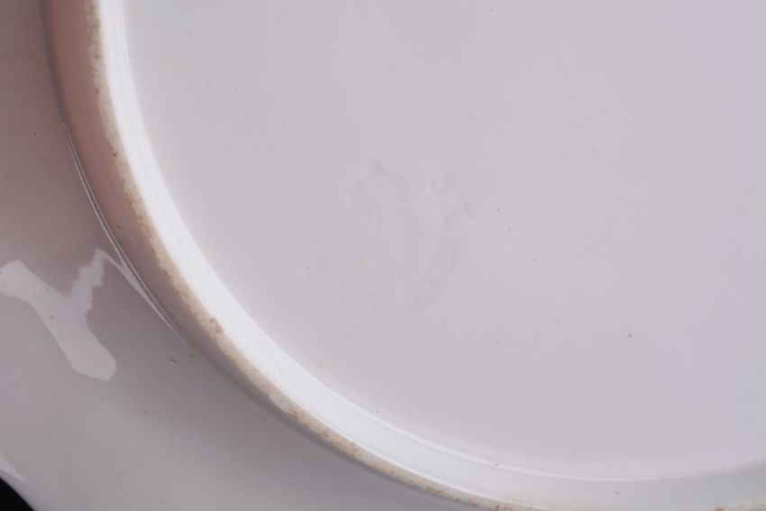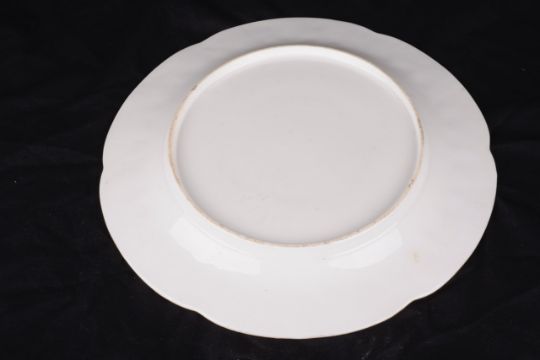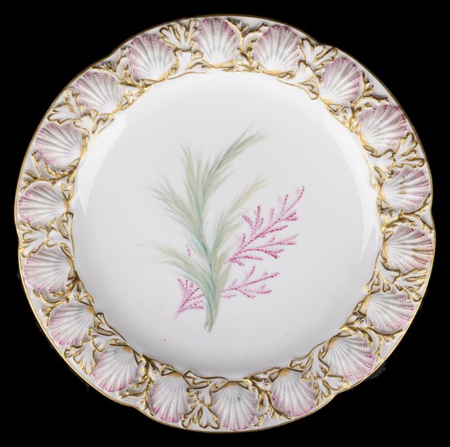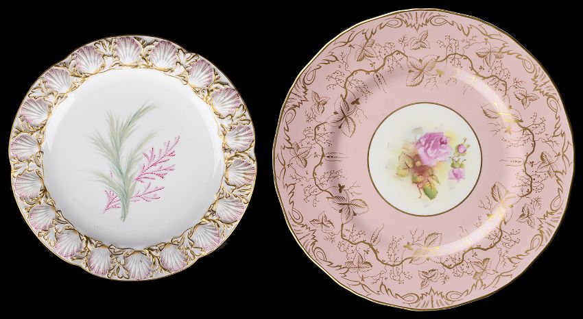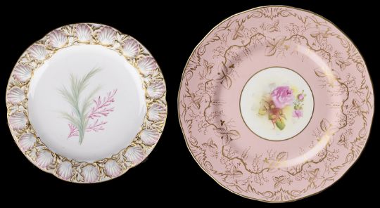 with wide pink border decorated with gilt branches and leaves with central panels painted with roses and signed M. Miller, for Miss Michelin Miller date marks for 1954, together with an earlier cabinet dessert plate moulded with cockle shell border the centre painted with coral and seaweed (2)