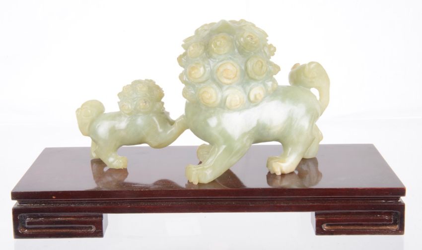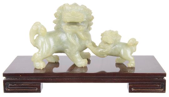 A contemporary celadon jade carving of a kyrin and young