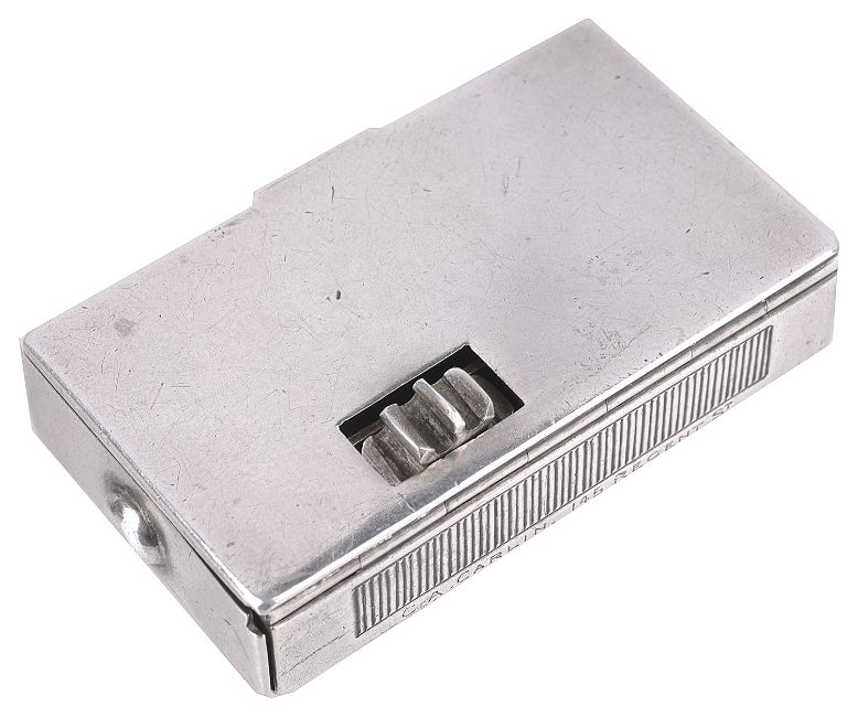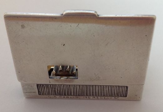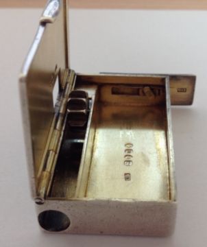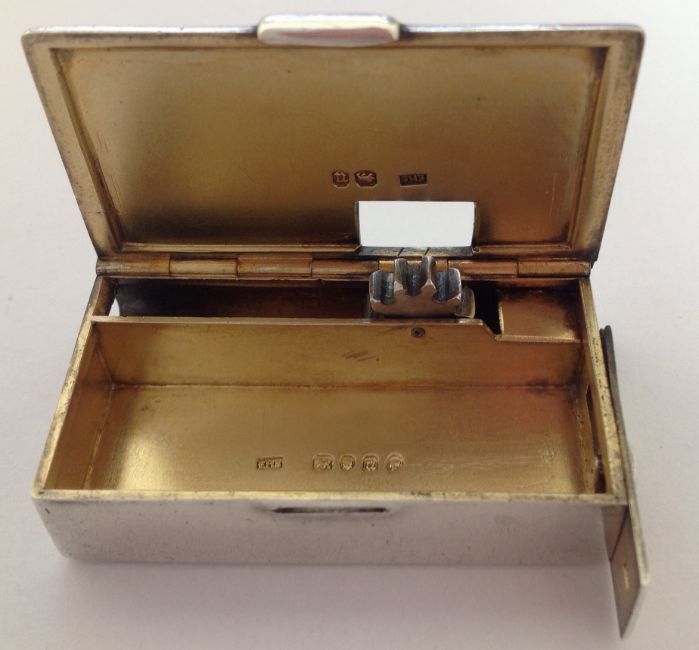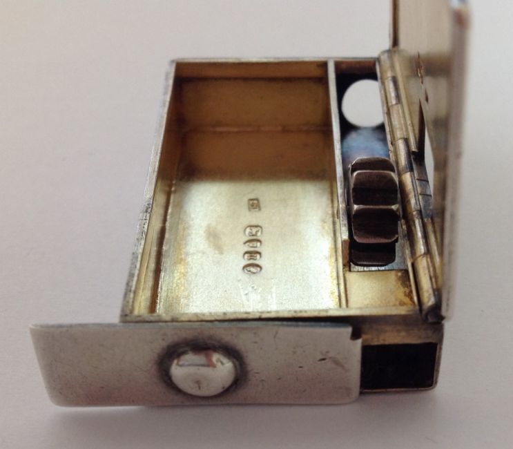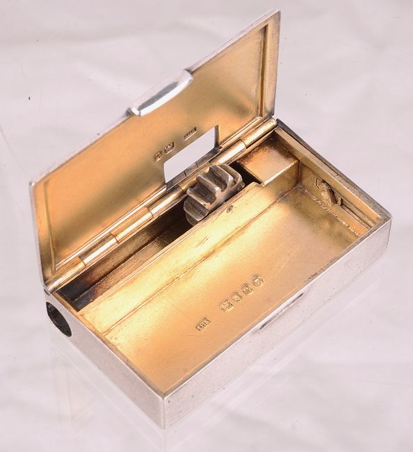 of rectangular form with hinged lid, with knurled wheel taper holder and moveable end, silver gilt interior, by Edward H Stockwell.