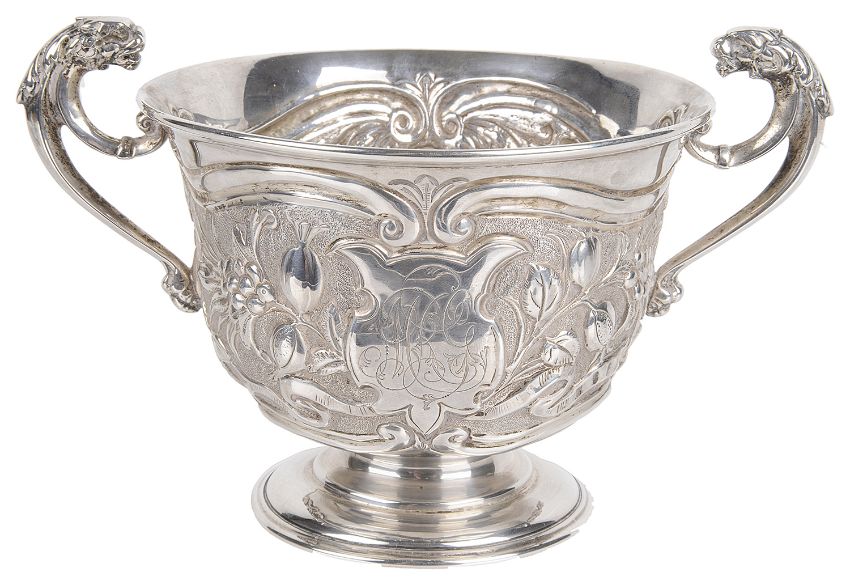 the bowl heavily embossed, decorated with acanthus leaves, trailing vines and central engraved cartouche and mask on the opposing side, the c-scroll handles with lion head terminals, raised upon a circular foot ring, by James Wakely & Frank Clarke Wheeler.