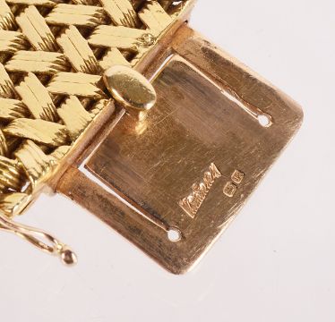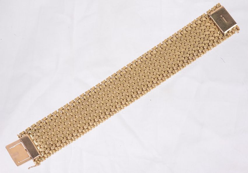 the wide bracelet of herringbone woven design with raised edges, invisible push clasp fastening, marked for 18ct and having both full Kutchinski signature and initial mark