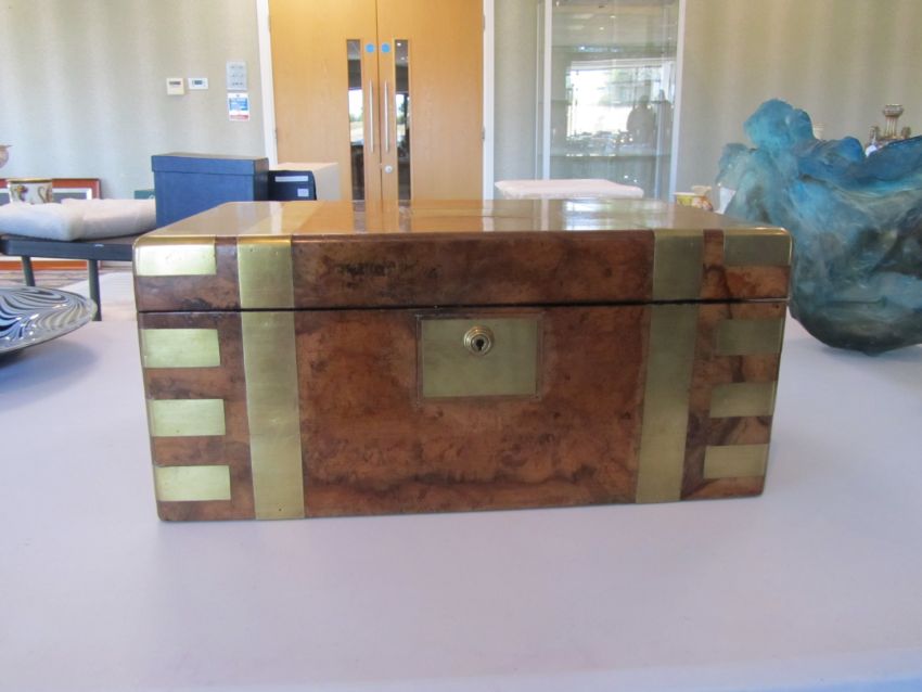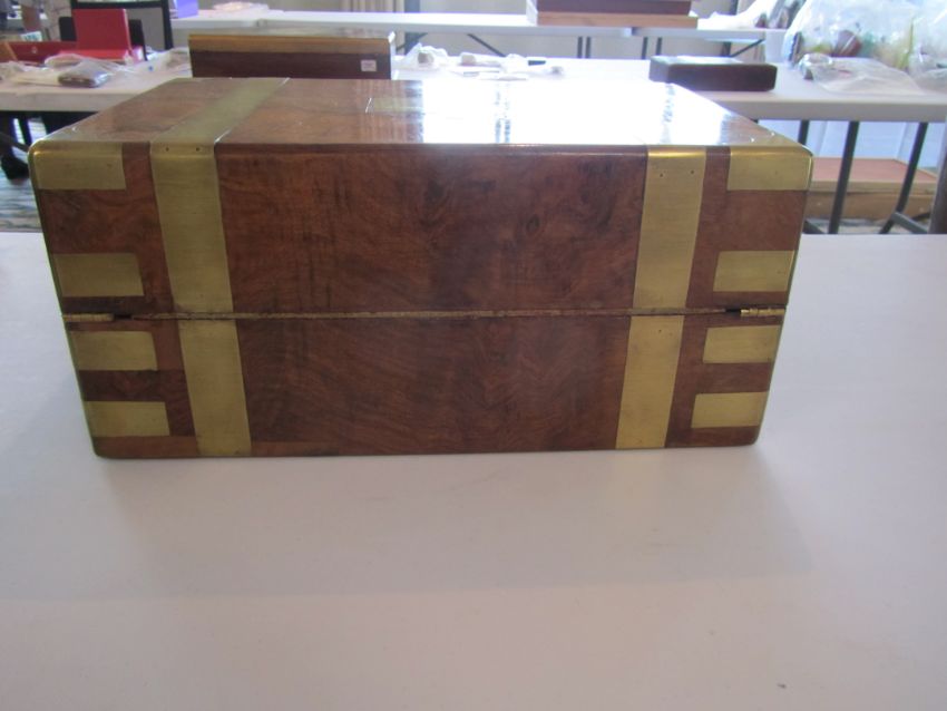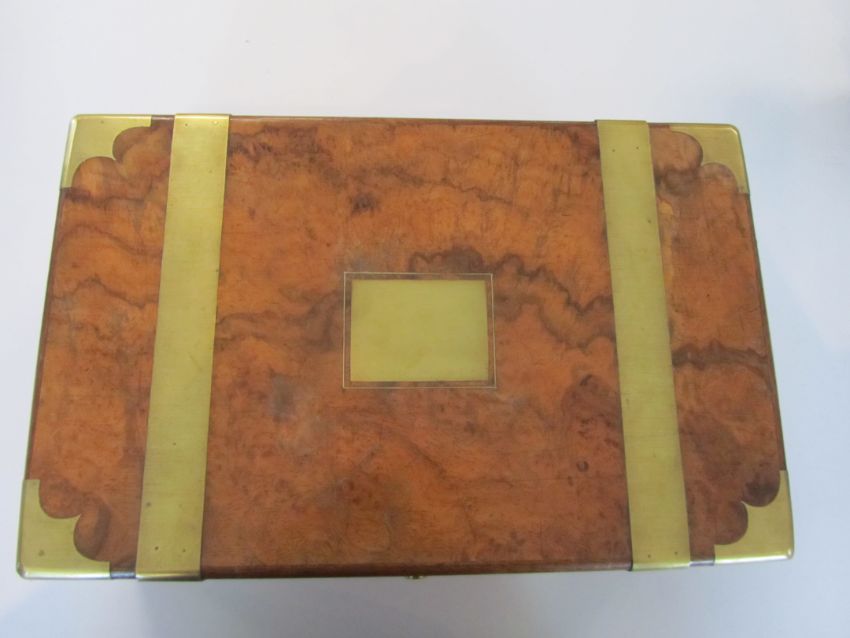 of rectangular form with brass banding and strapwork, the interior fitted with leather lined writing slope, compartments and secret drawers, with Bramah lock and manufacturers label.
