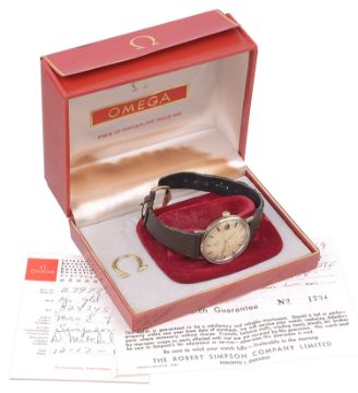 Condition: Fair to good, with wear throughout the case, strap and plexi glass, strap needs replacement, gilt metal buckle NOT Omega, mechanism NOT tested, running at time of cataloguing.