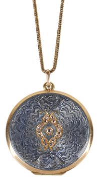 the blue guillioche enamel locket with gold edged rose diamond scroll decoration to centre and with further silver enamel detail, the locket hinged at the bottom, similar enamel to reverse, stamped .750, Geneve and F B E, suspended on a yellow metal woven chain