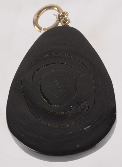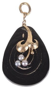 the tear shaped pendant set with a yellow metal and grey cultured pearl trefoil in the form of a stylised flower, tests for gold