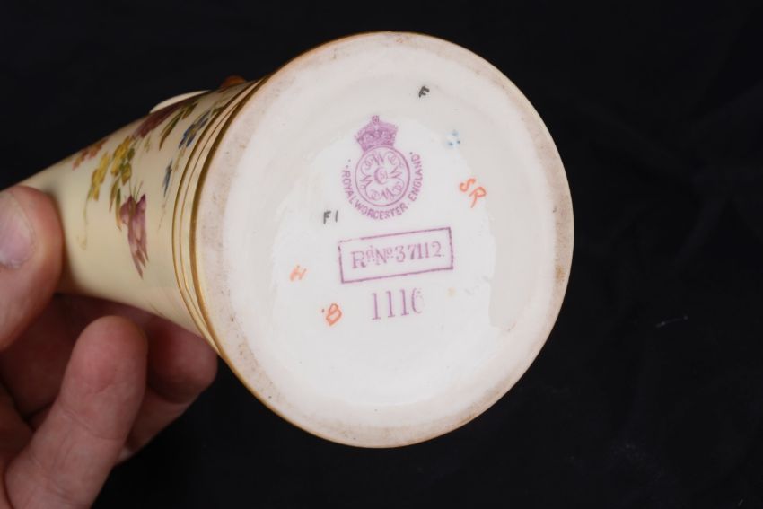 with handle modelled as antlers, decorated with summer flowers, with puce mark to base number 1116