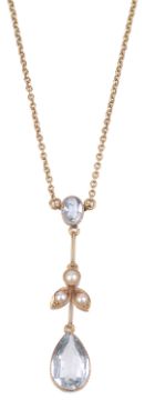 the tear shaped aquamarine suspended from a seed pearl foliate trefoil and with oval aquamarine and bar link above, original neck chain, the pendant and fastening ring both stamped 15ct
