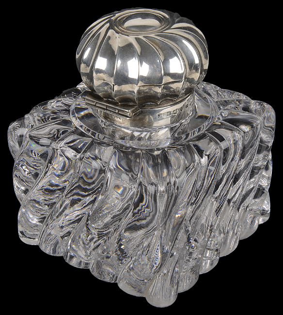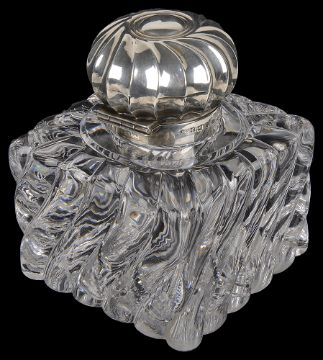 A large Victorian silver and glass desk inkwell, hallmarked Birmingham 1891