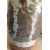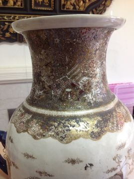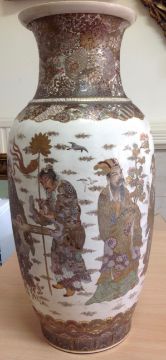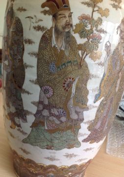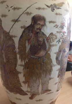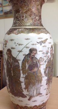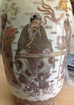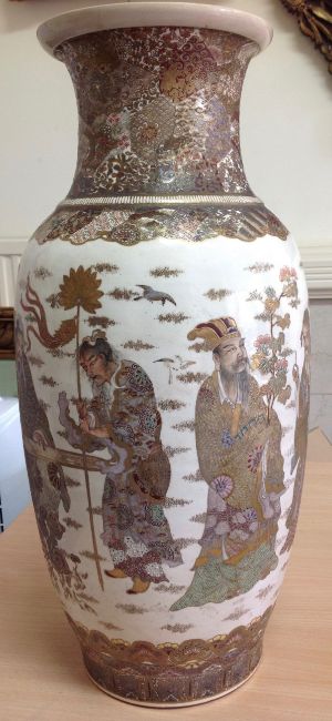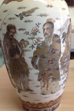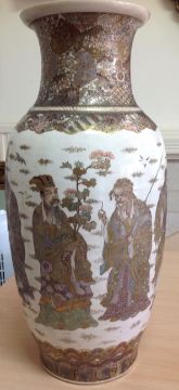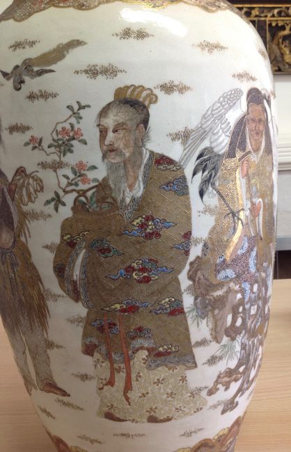 the cream ground body well decorated in the traditional palette with eight Immortals, one playing a Japanese harp another with a heron on his shoulder, their robes painted with with detailed coloured and raised gilt detail, the neck and base decorated with detailed coloured geometric designs and with raised gilt detail