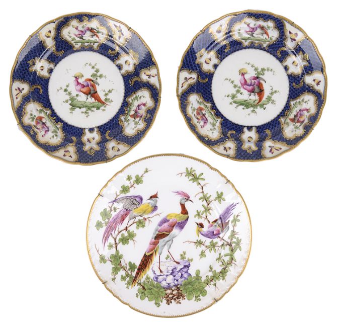 painted with exotic birds and insects against a cobalt blue fish scale ground, with gilt rim and fret mark to base, together with a Samson porcelain plate decorated in the style of James Giles with gilt lined scalloped rims with gold painted anchor mark to the reverse (3)