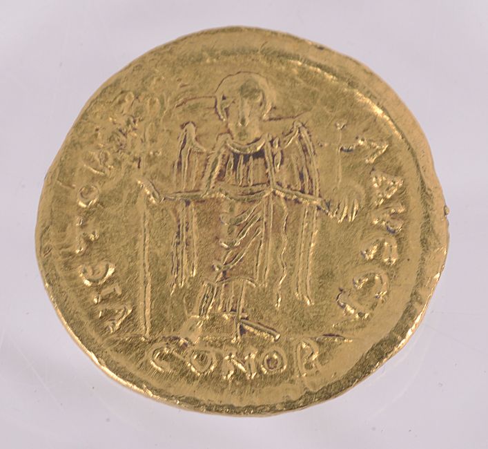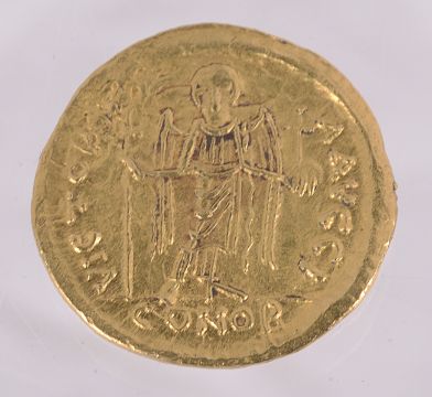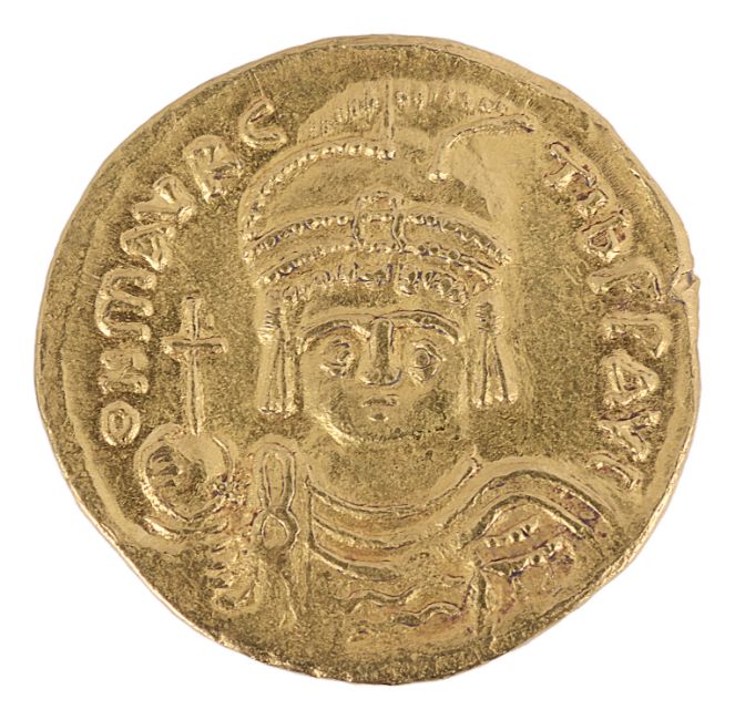 a helmeted Justin II holding a cross, with Constantinopolis seated holding a spear and globe reverse.
