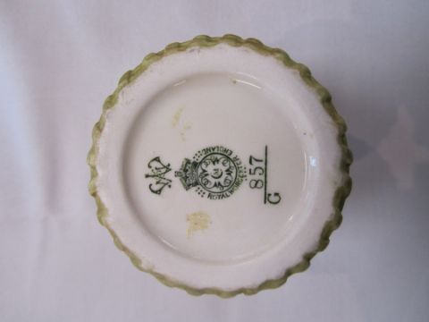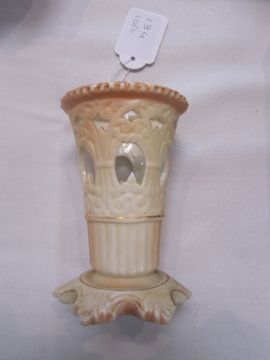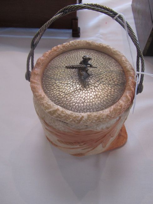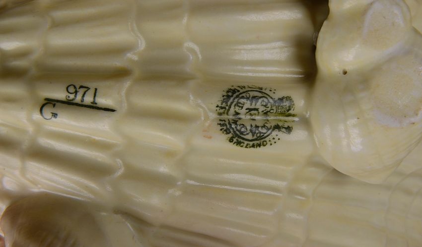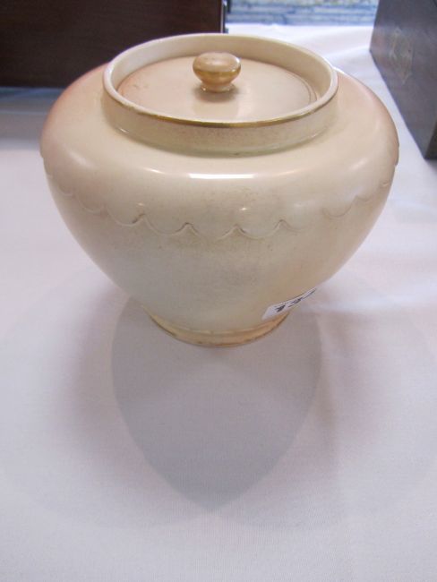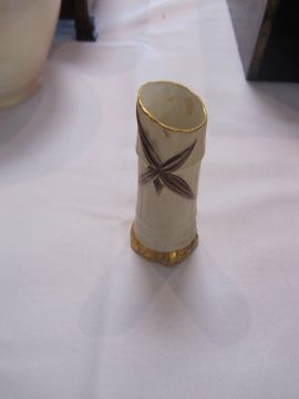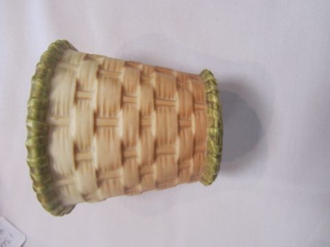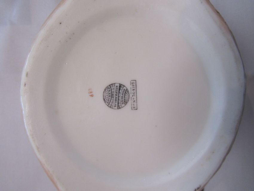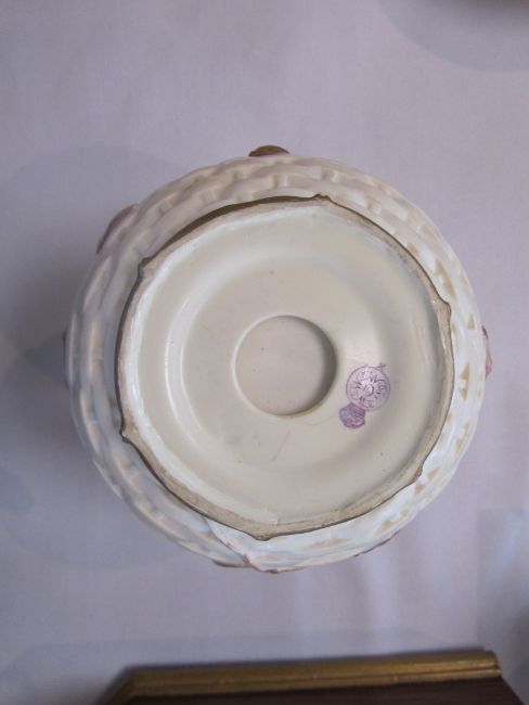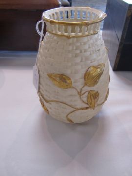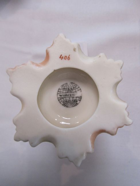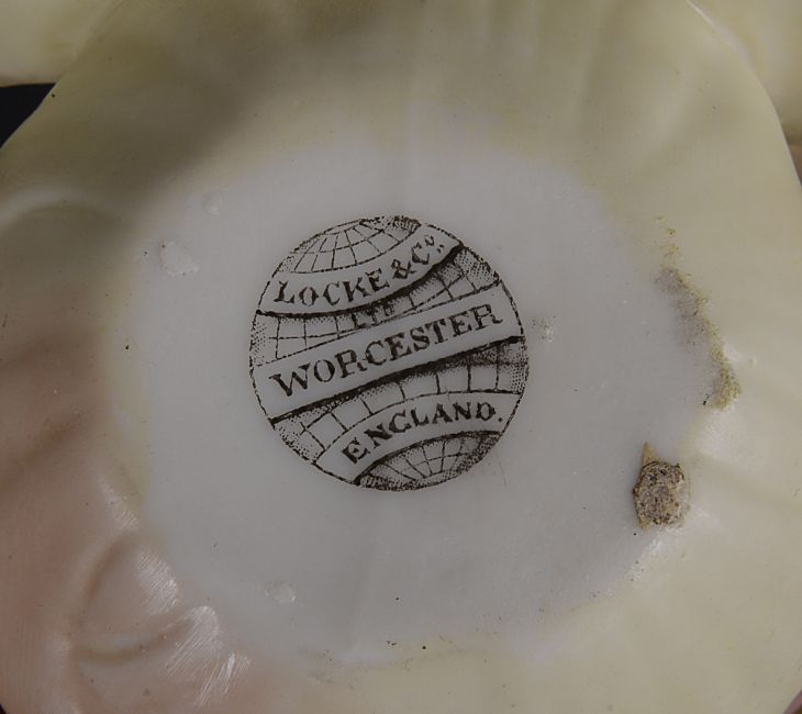 comprising a small basket weave pot number 857, a shell shaped dish number 971, vase with basket weave ground and moulded gilt leaf pattern and printed puce mark, a small spill vase number 1049, a vase and cover number 1281, a single coffee cup and saucer, a shell vase spill vase and a Locke & Co bon-bon dish and Locke & Co three bud vase, a Locke & Co Worcester biscuit barrel with moulded leaf pattern and metal handle and lid with squirrel finial (11)