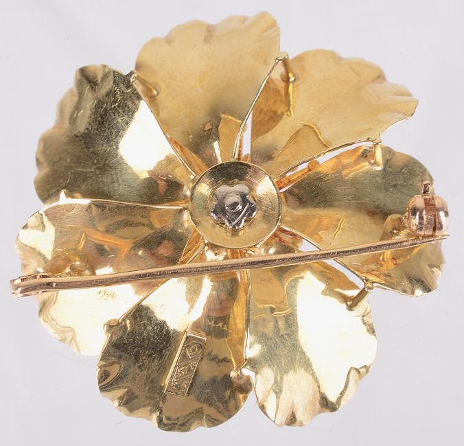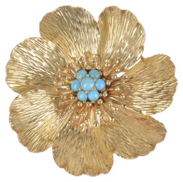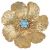 having central turquoise cluster within splayed petals and with textured detail, yellow metal tests for gold, unmarked