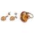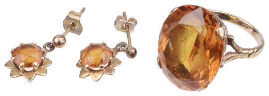 A large gold mounted citrine fancy ring and a pair of similar ear drops