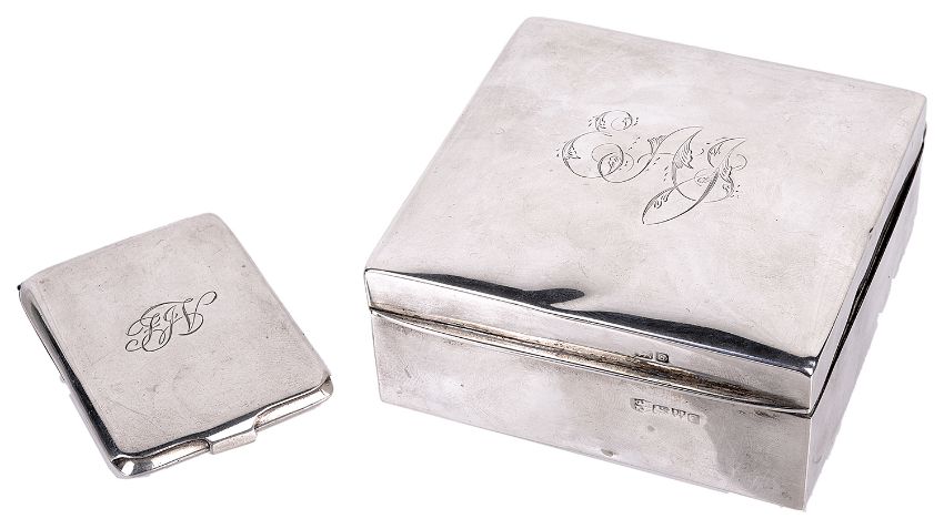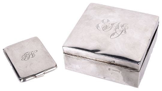 of square form with hinged lid and wooden interior, the lid engraved with initials 'EAJ' by George Nathan & Ridley Hayes, together with a George V silver match case, hallmarked Birmingham 1928, of rectangular hinged form, the front engraved with initials, makers stamp H.V.W., (2).