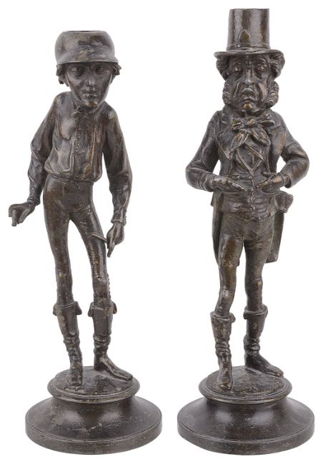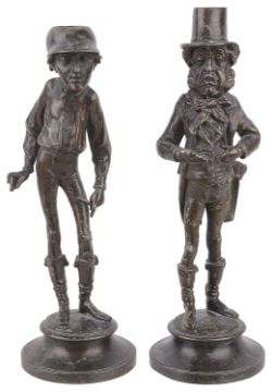 the first modelled as a jockey standing upon a circular socle base and the other modelled as the horse owner upon a circular socle base, signed indistinctly, (2).