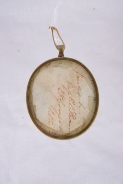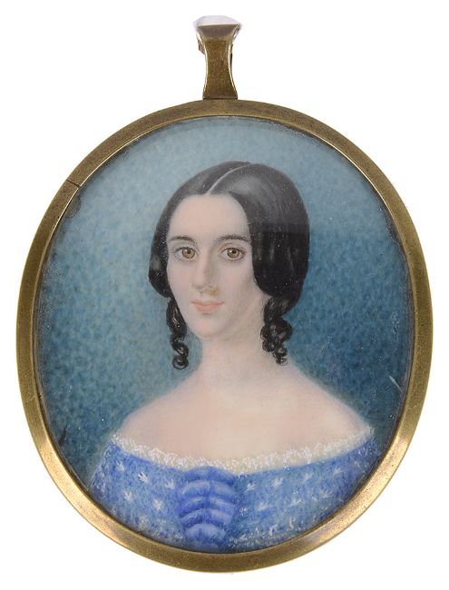 the three quarter portrait of the young lady wearing a blue-off-the-shoulder dress with lace detail, contained within an oval brass frame, the reverse of the frame with written inscription to paper label 'painted by Miss C. C. Thornton?? 25 George St Edinburgh'