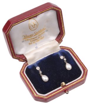 A pair of attractive Continental Edwardian diamond and cultured pearl ear drops