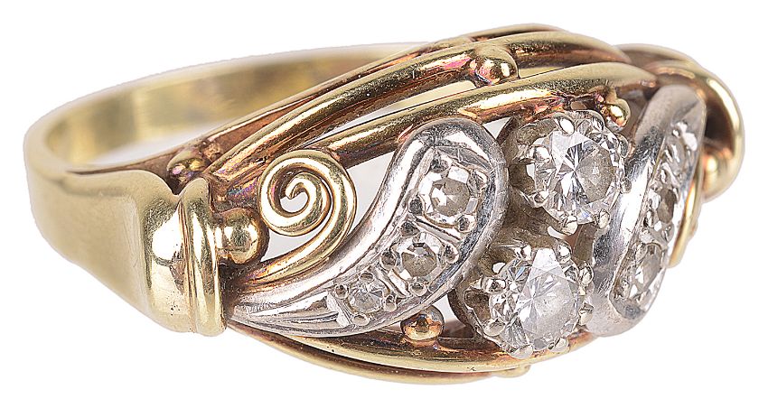 An attractive Continental, Edwardian style diamond set scroll ring