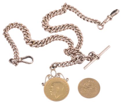 A 9ct rose gold curb link watch Albert with sovereign fob and a half sovereign coin