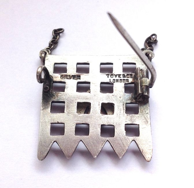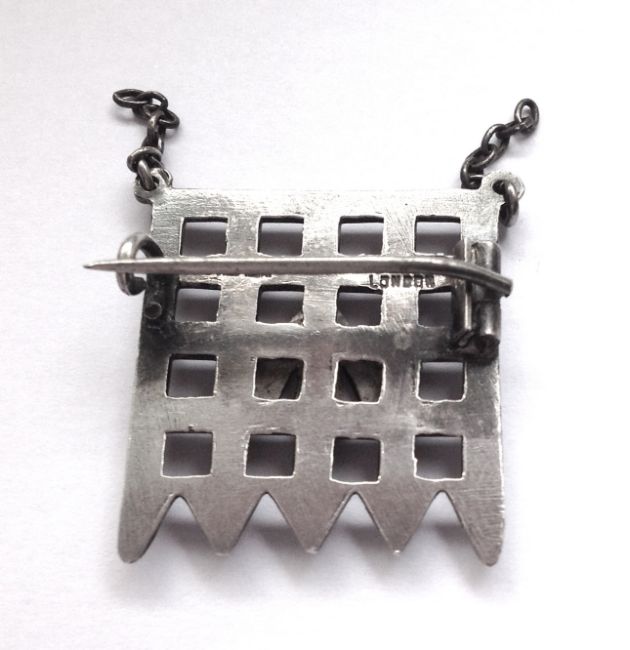 A rare Suffragette Holloway Prison silver brooch, modelled as a portcullis with applied conflict arrow enamelled in the Suffragette colours of purple, white and green, the reverse with link chain, stamped silver and Toye & Co London. This brooch after the design by Sylvia Pankhurst, was awarded to members of the Women's Social and Political Union's who had been imprisoned for women's suffrage. "Described as the 'Victoria Cross of the Union', the design is of the Portcullis symbol of the House of Commons, the gate and hanging chains are in silver and the superimposed broad arrow in purple, white and green enamel". Weight: 0.168ozt; 2.5 x 2.1cm approx.Condition:Fair to good, with minor wear, the link chain is broken, some wear to the enamel colours at the top of the arrow.