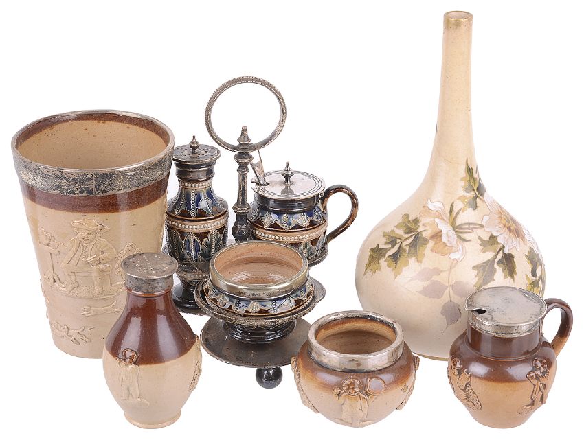 a Doulton Lambeth 'Carrara' pattern stoneware bottle vase, painted with flowers, factory stamp to base, together with Doulton Lambeth stoneware beaker with silverplated collar, a Doulton Lambeth EPNS stoneware cruet suite with EPNS stand, three Doulton Lambeth stoneware pepper and salt with silver collars and a mustard, each with factory stamps to bases, (9).