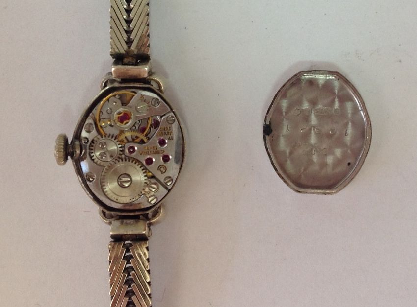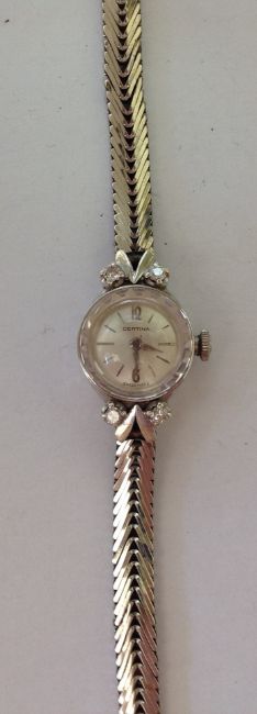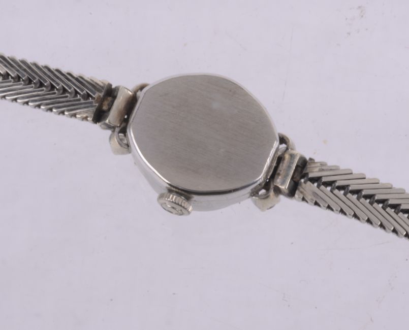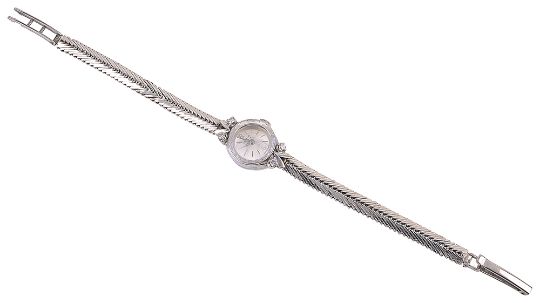the circular dial with numeral and baton hours, in an circular case with diamond detail, with herringbone link bracelet with clasp, manual wind, case no. 10321