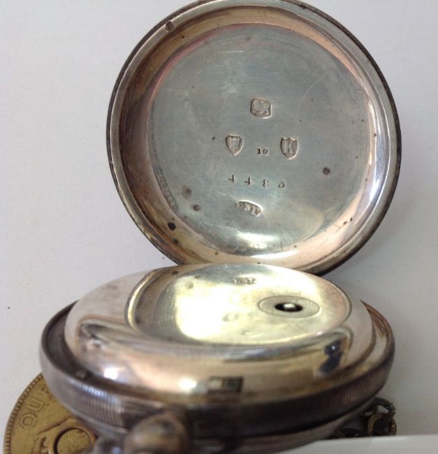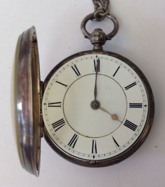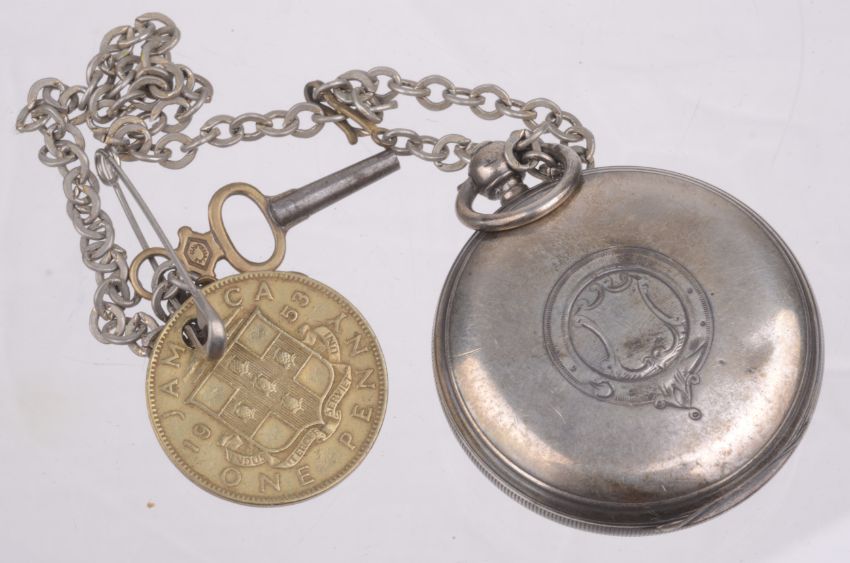 the white dial with roman hours, spade hands, in a silver circular case, case no. 4483, with key attached to a metal link chain with a drilled Jamaica one penny coin.