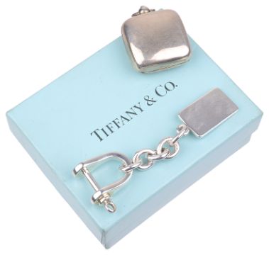 stamped 925, with single shackle and rectangular shaped fob, contained within Tiffany pouch and box, together with a silver sovereign holder of simple square form hallmarked London (2)