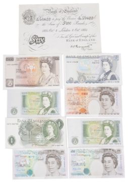 dated 8th Oct 1934, series A130 51622, together with two Bank of England £10 notes JA79 137930 and JN27 220883, three Bank of England £5 notes SD13 115458, C57 336991 EH88 309248 and three Bank of England £1 notes HW73 882788, 69W 424372 and DU60 040452, (9).