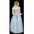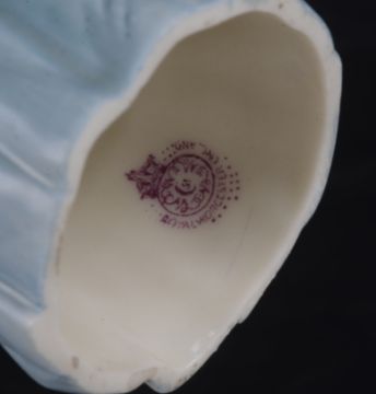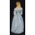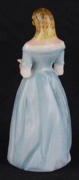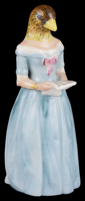 wearing a blue dress with a pink bow holding a manuscript, with puce mark to the inside