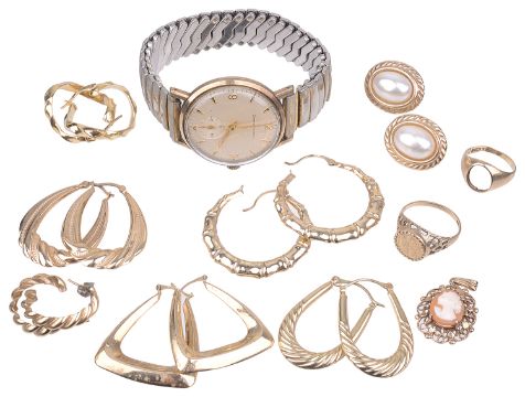 to include six pairs of 9ct gold hoop earrings, a small fine gold coin mounted ring, a Smith's 9ct gold automatic wristwatch on gilt expanding bracelet, a 9ct gold carved shell cameo pendant on chin, a ring a.f. and a pair of stud earrings (Q)