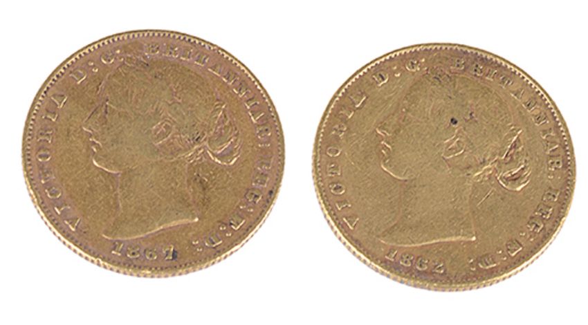 a Queen Victoria 1862 gold full sovereign, Sydney Mint, young head of Queen Victoria facing left, with Australia in a wreath reverse and a Queen Victoria 1867 gold full sovereign, Sydney mint, young head of Queen Victoria facing left, with Australia in a wreath reverse, (2).