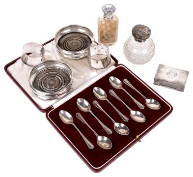 A selection of silver, bottle coasters, napkin rings, cased coffee spoons, silver topped scent bottles