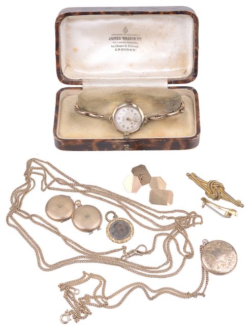 to include a finely woven longuard chain, tests gold, a pair of 9ct gold Art Deco cufflinks, a small Georgian hair locket, tests gold, a gold cased hinged triple opening, four picture locket 'patent 27214' suspended from yellow metal chain, tests gold, a 9ct gold cased ladies wristwatch on 9ct gold expanding bracelet, with original box, a locket a.f. and a wishbone ring a.f., and a gilt brooch (Q)