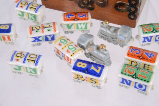 each set comprising of six carriages with colourful alphabet letters on the sides and numbers 1 to 10 on the tops and a loco, in an associated wooden box, a/f, (16 pieces).